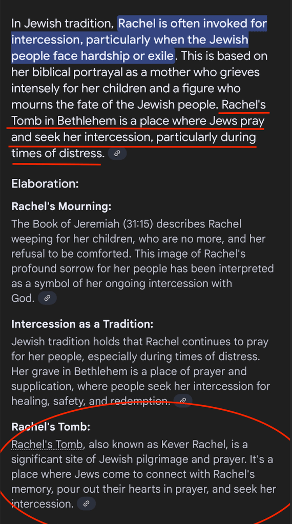 I personally think this information about Rachel is a really big deal. Our Jewish friends for thousands of years showed the world a different kind of religion. A religion of monotheism, the belief that there is only One true God. And yet, these protectors of monotheism see no competition between the worship of Yahweh and seeking the intercession of Rachel the Mother of all Israel. They don’t claim to worship Rachel, and don’t think that in asking for her intercession they are committing idolatry, a sin they take incredibly seriously.